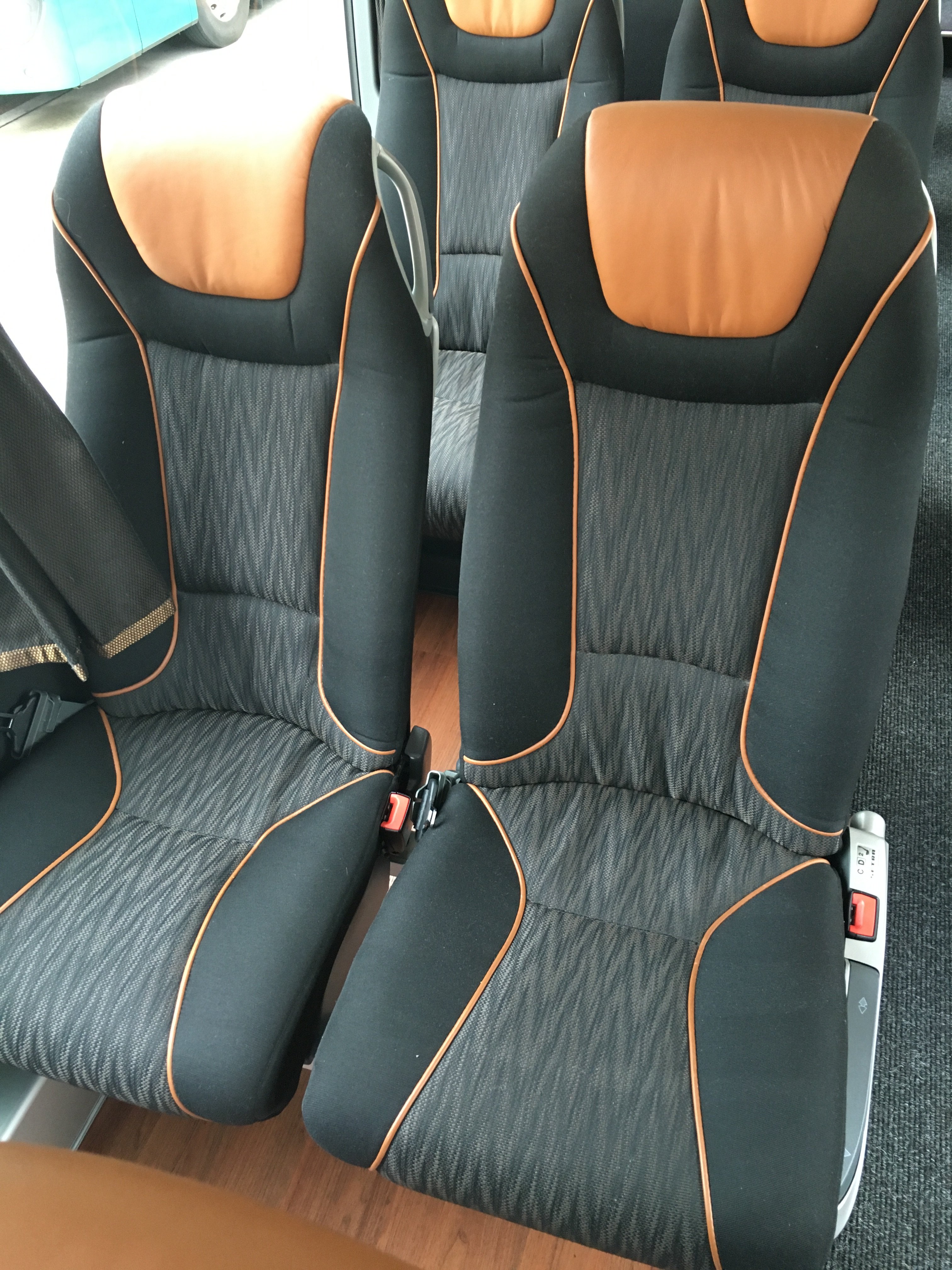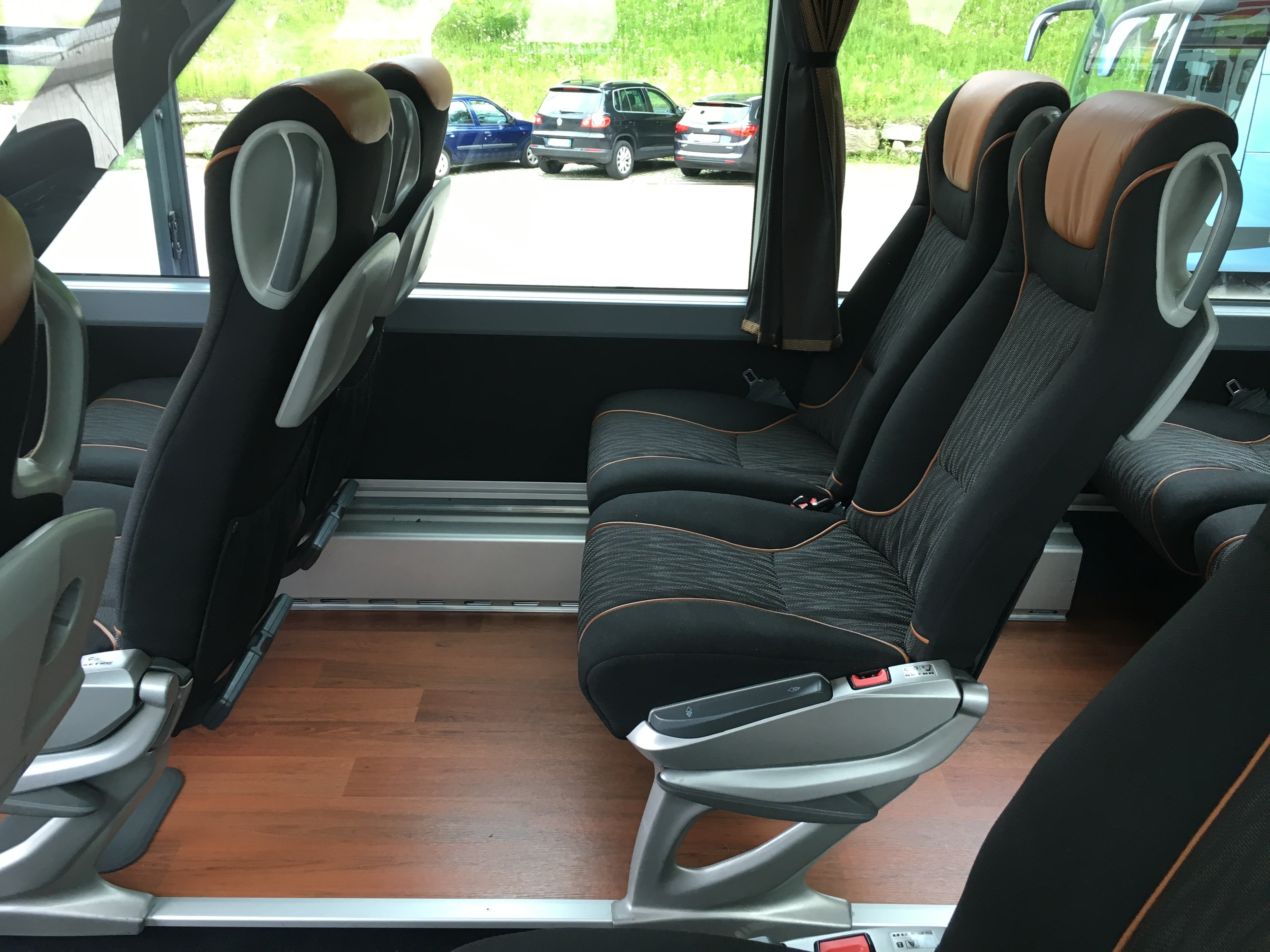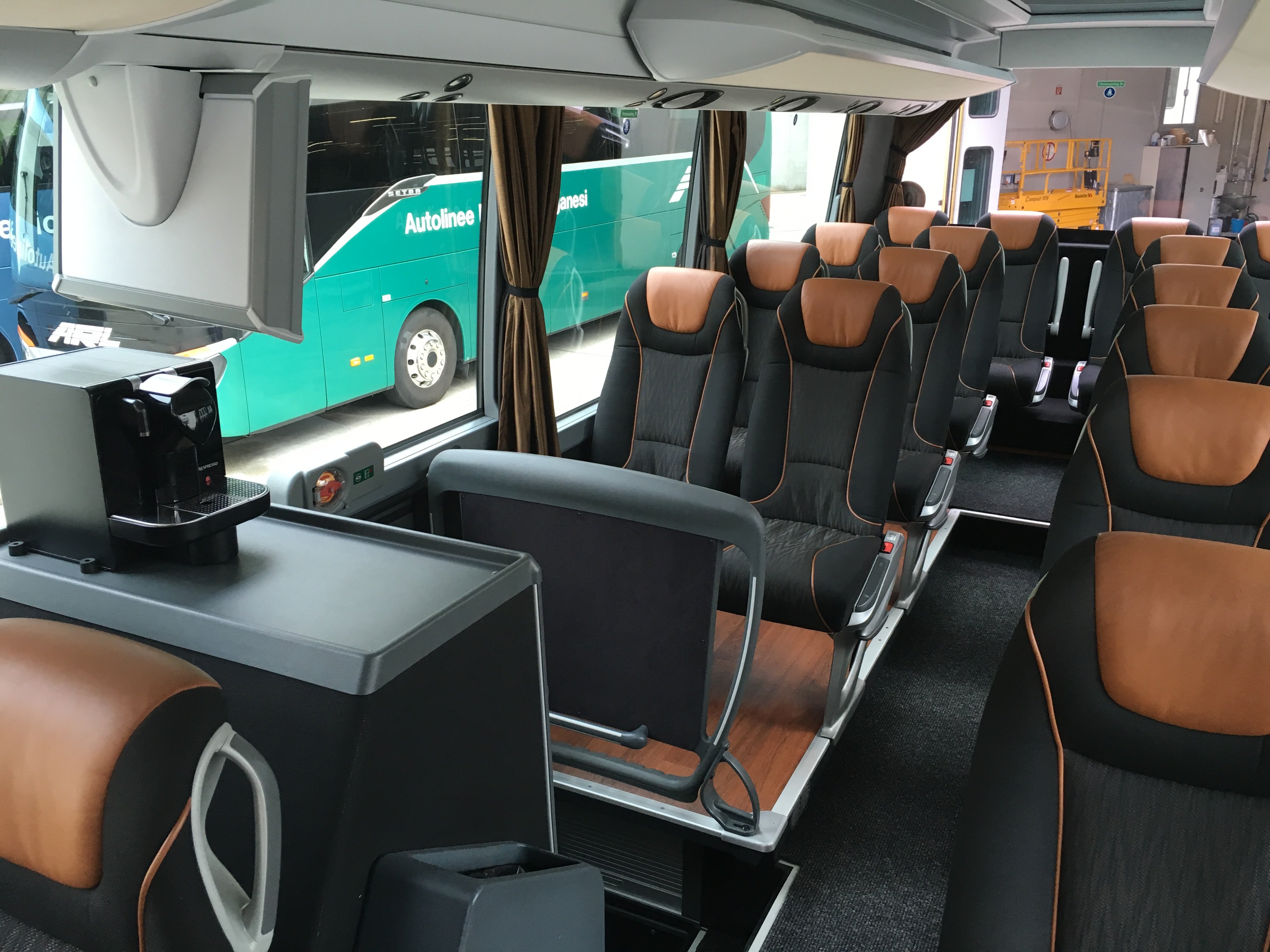 Dotazione: Cruise control, navigatore GPRS, TV – DVD 19 pollici, microfono, climatizzatore elettronico, sedili reclinabili, poggiatesta in pelle, poggiapiedi regolabili, tavolini con porta bicchieri, frigobar, macchina per il caffè nespresso, toilette, gancio rimorchio, bagagliaio capiente, tetto panoramico nel retro del bus.