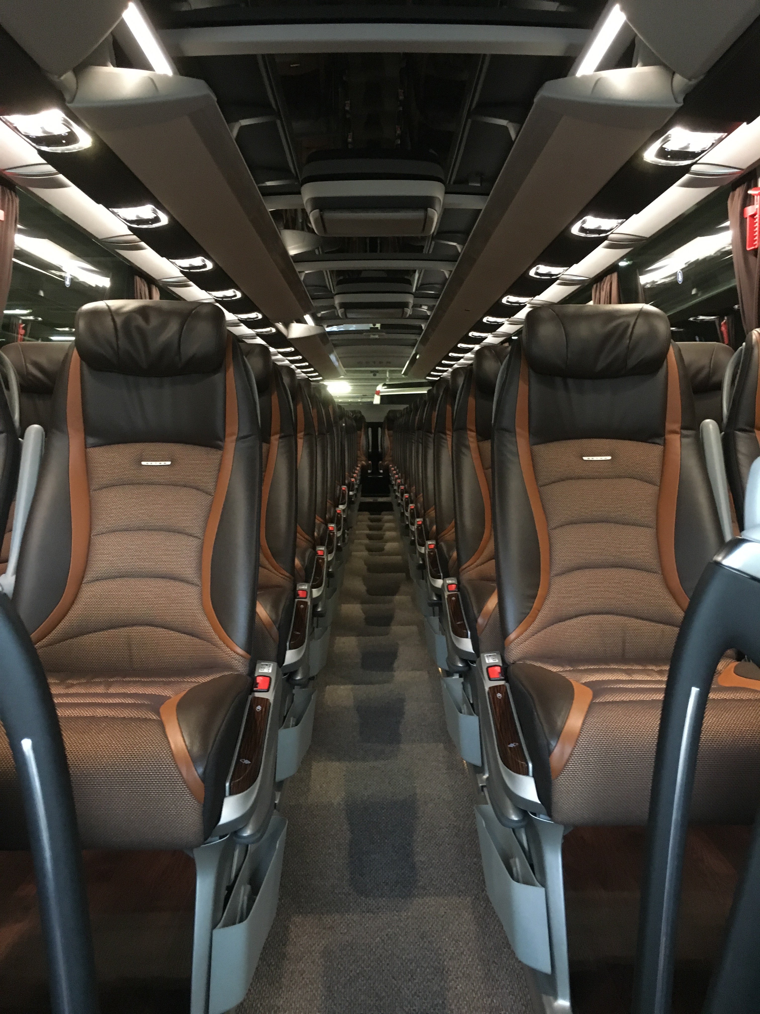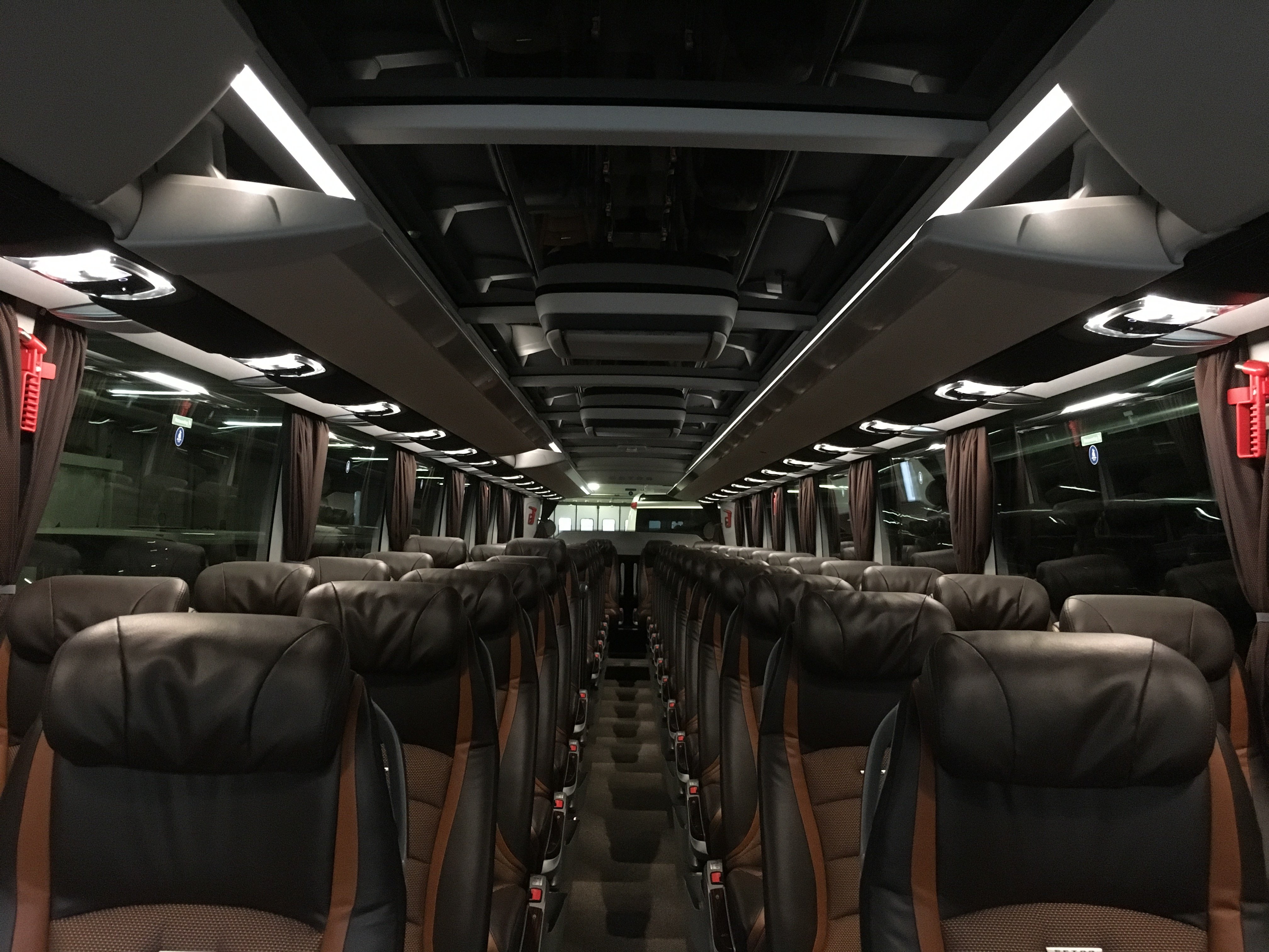 Dotazione: Tetto panoramico, Cruise control, navigatore GPRS, TV – DVD 19 pollici, microfono, climatizzatore elettronico, sedili reclinabili, poggiatesta in pelle, poggiapiedi regolabili, tavolini con porta bicchieri, frigobar, toilette, gancio rimorchio, bagagliaio capiente.